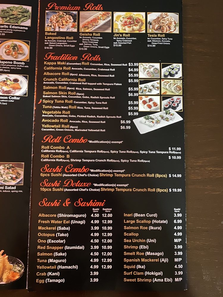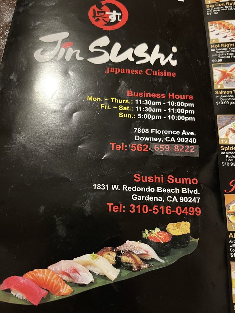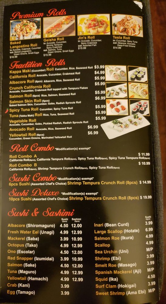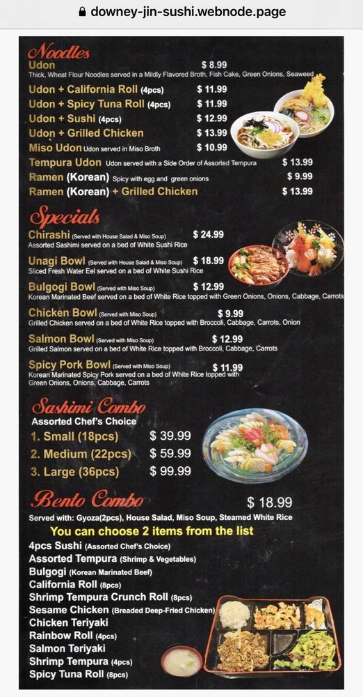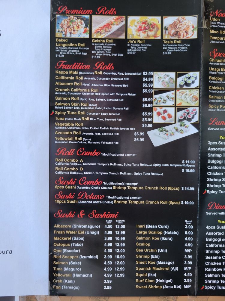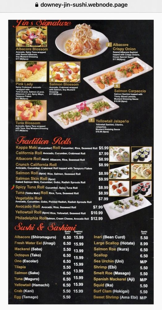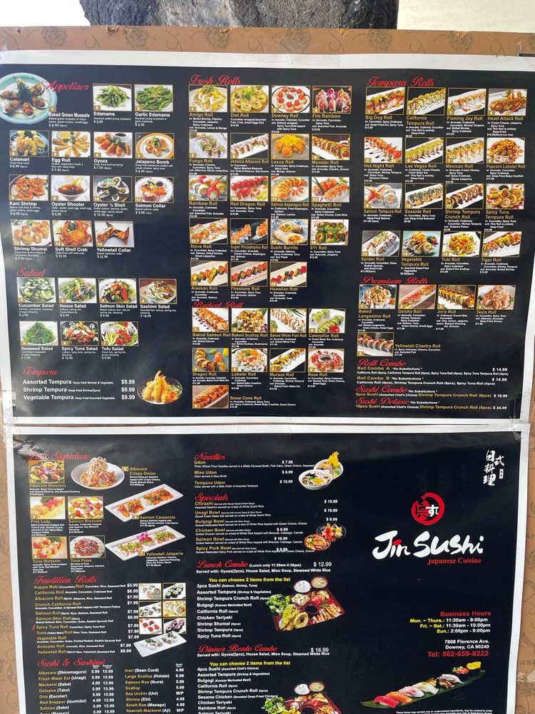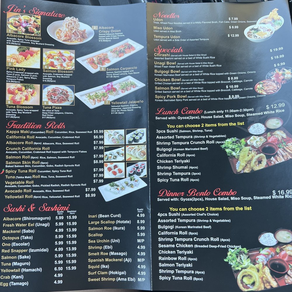 Jin Sushi, located in Downey, CA, offers a diverse menu of sushi, noodles, and Japanese dishes. With options for pescatarians, vegans, and vegetarians, Jin Sushi caters to a variety of dietary preferences. The appetizers, like Assorted Tempura and Baked Green Mussels, are flavorful and satisfying. The salads, such as the Cucumber Salad and Salmon Skin Salad, are fresh and tangy. Baked Rolls like the Baked Salmon Roll and Caterpillar Roll showcase creative combinations of ingredients. Customers praise the quality of the sushi, friendly service, and affordable prices. The cozy ambiance and efficient service make Jin Sushi a top choice for sushi lovers. Don't miss out on the opportunity to try their delicious and beautifully crafted dishes.