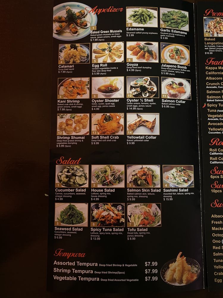 In: Avocado, Cucumber, Crabmeat, Shrimp TempuraOut: Avocado, Baked Fresh Water Eel